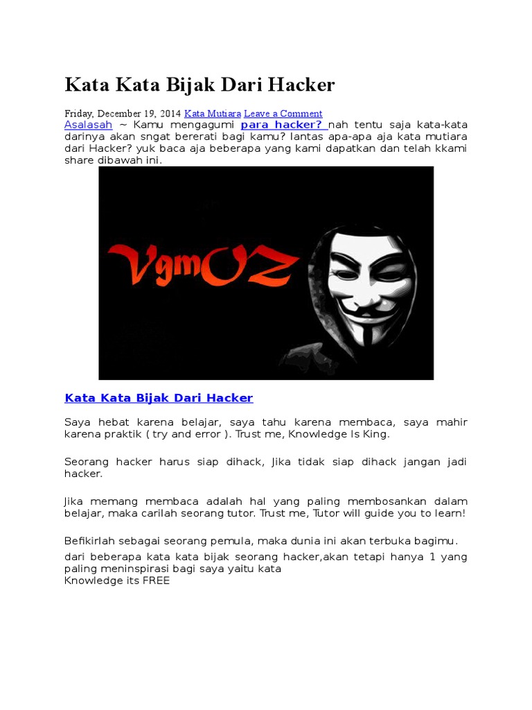 Kata kata bijak seorang hacker. Mereka merupakan sekelompok hacktivis internasional yang terdesentralisasi dan telah dibentuk pada tahun 2003. Kata kata bijak para hacker sebagai bahan inspirasi cirebon cyber4rt diawal bulan yang sangat indah ini saya akan sedikit mengutip beberapa kata kata bijak para hacker pilihan yang menurut saya sangat bagus untuk menjadi bahan inspirasi ketika melakukan kegiatan hack menghack wew wkwkw d. Mungkin kata hacker ini sudah tidak asing lagi bagi kita yang sudah lama menggeluti dunia internet marketing.